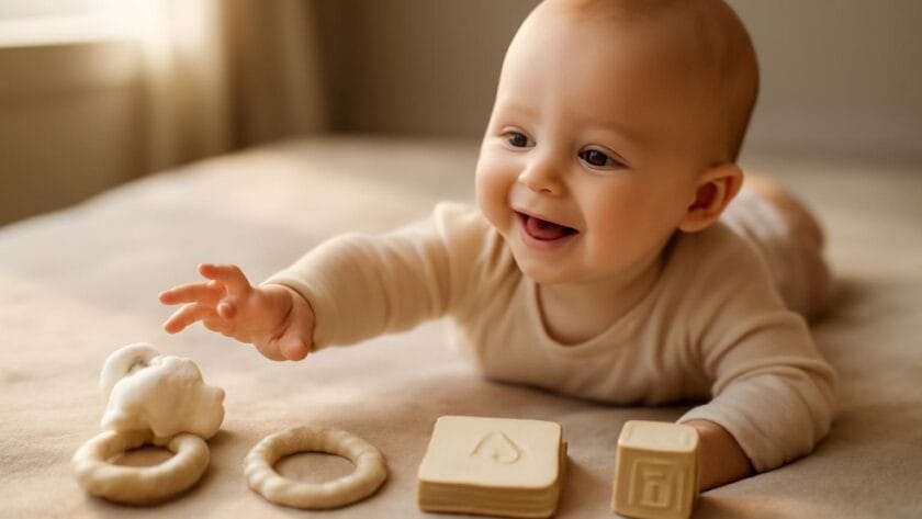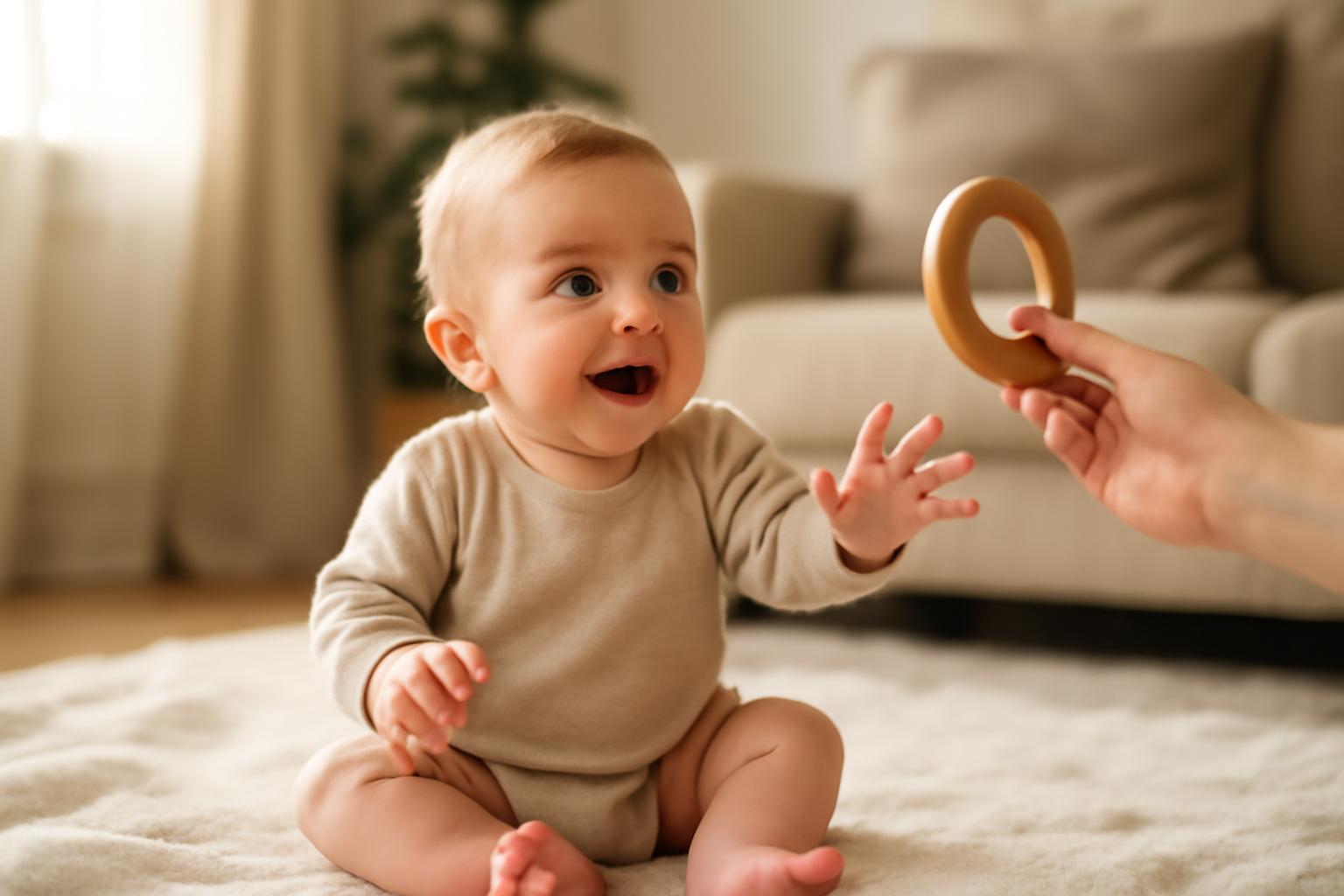 3. Rozwój mowy: Gaworzenie wchodzi w fazę głoskowania. Maluch eksperymentuje z dźwiękami, łącząc samogłoski ze spółgłoskami („ga-ga”, „ba-ba”).